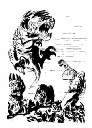 «Ситка Пит,—писал он,—по всей вероятности, разрешил проблему борьбы с отдельными экземплярами сфиксов, Он понял, что не имеет смысла душить их, так как когти не могут пробить даже верхний слой их шкуры. Сегодня Семпер оповестил нас, что стая сфиксов пронюхала дорогу на станцию. Ситка, спрятавшись с подветренной стороны, ожидал их прихода. Затем он сзади напал на сфикса и обрушил на его голову два страшных удара, сила которых была, вероятно, равна силе двух двадцатидюймовых снарядов, выпущенных одновременно с разных сторон. Такой удар расплющил череп сфикса, как яйцо, и он свалился замертво. Затем Ситка такими же мощными шлепками убил еще двух сфиксов. Сурду Чарли с ворчанием наблюдал за схваткой, но когда сфиксы набросились сзади на Ситку, он поспешил ему на выручку. Я не мог стрелять, так как боялся попасть в него, и ему бы пришлось совсем плохо, если бы из медвежьего загона на помощь не подоспела Фаро Нелл. Ее появление отвлекло внимание сфиксов и дало возможность Ситке еще раз применить свою новую технику. Поднявшись на задние лапы, он наносил свои ужасные удары. Битва закончилась быстро. Семпер все время кричал и летал над дерущимися, но, как обычно, к ним не присоединялся.