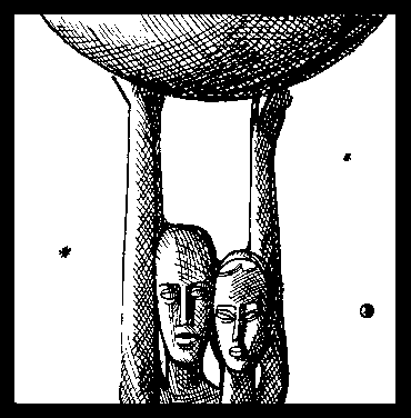 ... На вершине высокого холма вознеслась над городом и озером гигантская скульптура. Могучий великан обнимал тонкую фигуру женщины, протягивая к небу тяжелый шар планеты. В лицах, потемневших от времени, угадывались мужественные черты Гела и нежные — Аймы.