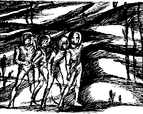 Мейстер, биолог, был сплошь увешан коробками для образцов, закрывавшими его стройный торс. Майор Гамс нес аварийное снаряжение, бинокль и автоматическую винтовку. Вивиан Беллис, минералог, разбиравшаяся в своем деле ровно настолько, насколько позволял краткий трехмесячный курс, несла легкое ружье, геологический молоток и мешок для образцов. Мисс Мак-Карти — ее знали только по фамилии и никому не было известно, как ее зовут, — к науке никакого отношения не имела. Она была приставлена к группе от Службы Гражданской безопасности. На ней висели два толстых пистолета и туго набитый патронташ. У нее была одна-единственная обязанность — разнести черепушку любому члену группы, пойманному на использовании недозволенных средств общения или вообще ведущему себя странно в каком-либо отношении.