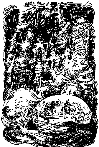 Амфибия круто изменила курс и на предельной скорости помчалась к плато Звездолета. «Снегопад» с поверхности океана на небо продолжался. Все гуще валили взрывающиеся в вышине хлопья стреловидных кристаллов. Налетел шквал. Он превратил пирамидальные волны в столбы бешено вихрящихся смерчей, соединивших океан и небо. Амфибия неслась теперь сквозь фантастическую колоннаду.