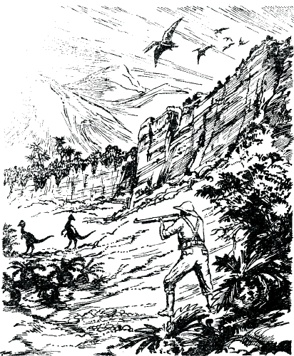 Не буду подробно рассказывать об этом переходе. Никакого крупного зверя. Только горгозавр, которого не достать было пулей, промелькнул мимо нас вдалеке, да еще наткнулись на следы огромного игуанодона. Новый лагерь мы раскинули у подножия холмов.