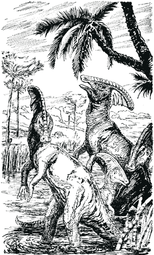 Одно из высохших русл, прорезывавших рощу, пересекало наш путь у дальнего края группы карликовых пальм. Глубина русла была футов шесть. Оно-то и служило лежбищем тираннозавру, отсыпавшемуся после сытной трапезы. Папоротники на краю русла скрывали вздымавшуюся спину. Джеймс разрядил оба ствола над головой теропода и разбудил его. Затем Джеймс побежал вперед, не перезарядив ружья. Еще каких-то двадцать шагов — и он вскочил бы тираннозавру на спину.