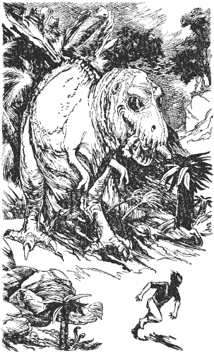 — Боже мой! Опять он за свое! — простонал я. Внезапно послышался громкий свистящий звук и дикий вопль Джеймса. Что-то огромное вздыбилось и выплыло из кустарника... Я узнал голову крупнейшего из плотоядных того времени — самого тираннозавра-трионикса.
