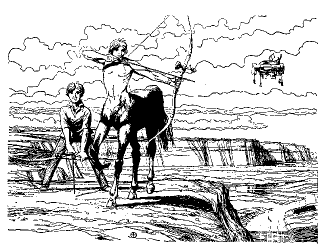 Алексей шагнул к двери за Майклом. Тот распахнул ее и вдруг отшатнулся. Мимо со свистом пролетела оперенная стрела и вонзилась в тонкое деревце у крыльца, вздрагивая и покачиваясь, а следом с победным криком проскакали кентавры, размахивая луками.
