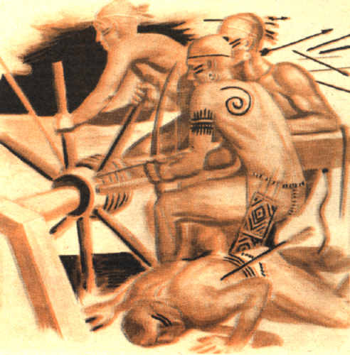 Огромные двойные каноэ Тумунуи, продвигаясь вдоль Нан-Молукана, высаживали отряды воинов. Оглашая воздух диким свистом, они карабкались на террасы и насыпи. Устилая своими телами базальтовые платформы, облепили укрепления Томуна... Хрипы и стоны раненых, крики сражающихся — все это катилось в сторону внутренней гавани. Томун едва продержался до заката — и пал. Флот Тумунуи заполонил бухты, факелами запылали немногие боевые каноэ Нан-Мадола... К ночи разразился шторм, и ураганный ветер гнал на город тучи искр, тлеющие паруса, обломки мачт. Нан-Мадол горел. Огненное зарево охватило полнеба.