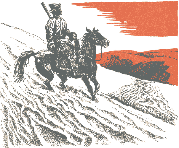 Коротконогая лошадка, увязая по бабки в песке, резво пробиралась между барханами. Со склонов она почти съезжала, подогнув задние ноги и едва перебирая передними. Цэвэн то наклонялся к шее коня и ложился грудью на высокую луку, то откидывался, упираясь гутулами — высокими кожаными сапогами — в стремена. Все это не мешало зорко посматривать по сторонам: все-таки он ехал через опасные пески Халдзан-Дзахэ. Хорошо, что очки купил, будто вернул молодые глаза.