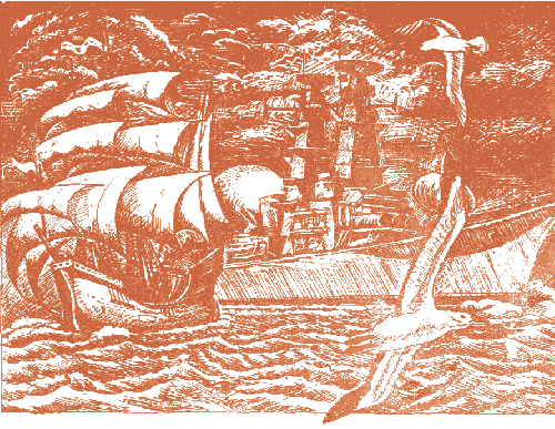 В памяти мелькнул эпизод из детской кинокартины: залитая ярким солнцем, в море выходит празднично расцвеченная флагами каравелла. Гремит оркестр, ослепительно сияют медные пушки, а над кораблем сверкают белизной крылья парусов, похожих на утренние облака. У борта ласково плещутся синие волны. Каравелла, выкрашенная в темно-коричневый цвет, удивительно гармонирует со всем миром и легко скользит по воде. Именно скользит: не вспарывает ее, не бороздит, а несется неслышно, словно над волнами летит огромная сказочная птица...